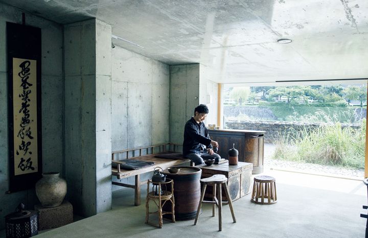 2015年に町家宿〈鴨半〉を開くと、その並びに構えたのは宿泊者をもてなす〈茶室/茶藝室 池半〉。24年には井戸を掘り、ホテル〈鴨半 母屋〉と誰もが気軽に足を運べる茶房〈池半 分室〉を作り上げた。打ち放しのコンクリートに取り合わせたのは時代を経た家具や道具。