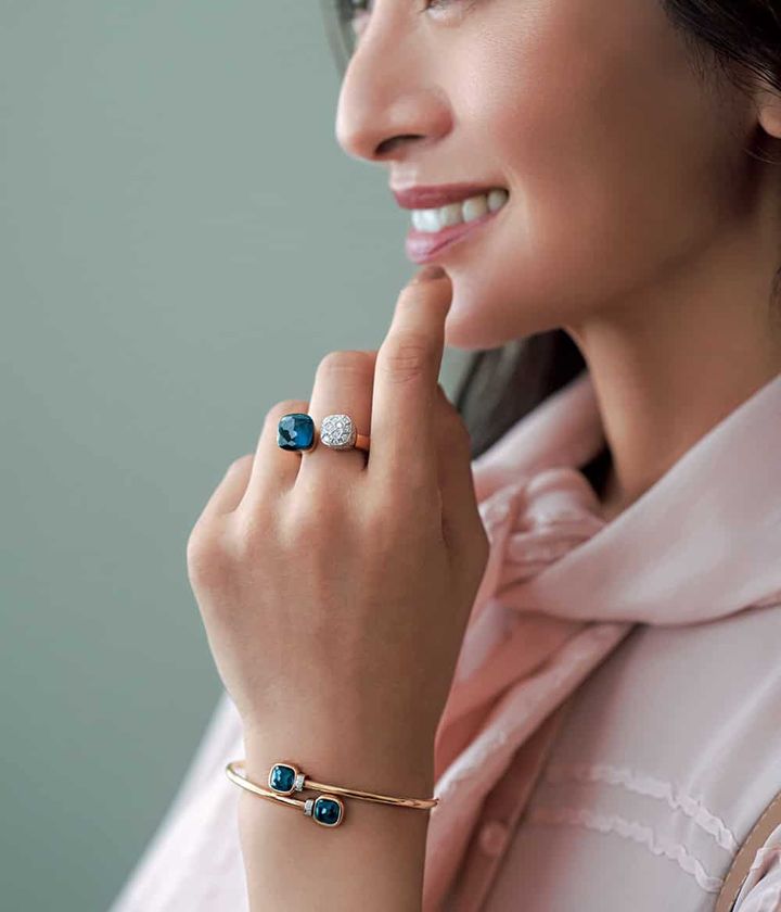 転勤などの節目に選びたい、ポメラートの「ヌード」。知性を感じさせるブルーが、自分らしさを映し出し、転機へチャレンジする勇気をくれる。すべてを満たすその輝きは心の充実を象徴するよう。メゾンの、既成概念にとらわれない革新的なスピリットから生まれた「ヌード」コレクション。卓越したクラフトマンシップでこそなしえる、ストーンが浮いたように見える瑞々しくモダンなデザインは、経験を重ねた女性の美しさを際立たせます。