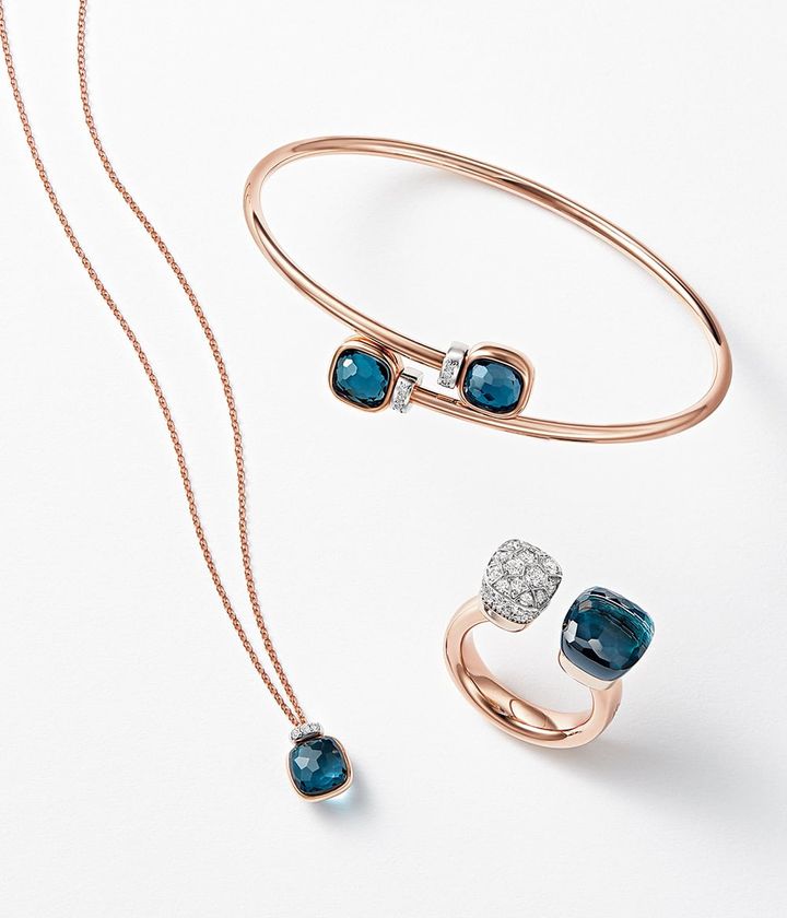 「ヌード ミニ」バングル〈RG×WG×ロンドンブルートパーズ×DIA〉¥814,000「ヌード」リング〈RG×WG×ロンドンブルートパーズ×DIA〉¥1,199,000「ヌード ミニ」ネックレス〈RG×WG×ロンドンブルートパーズ×DIA〉¥407,000(すべてポメラート/ポメラート クライアントサービス)