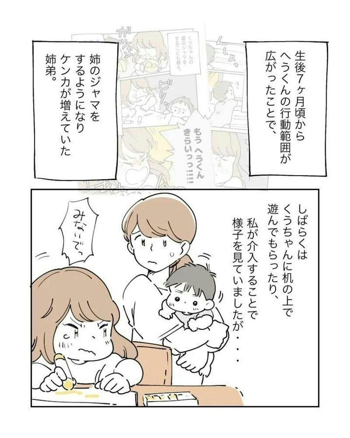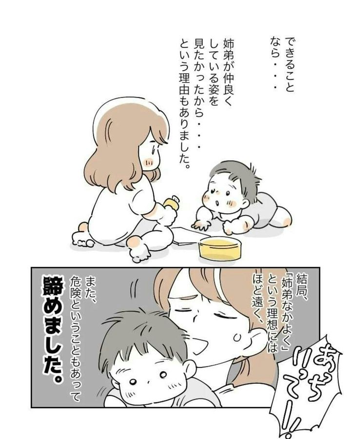 きょうだいが仲良く遊んでいる姿を思い描いていましたが、実現しそうもありません。ケンカが絶えず、また危険な場面もあったため、諦めます。