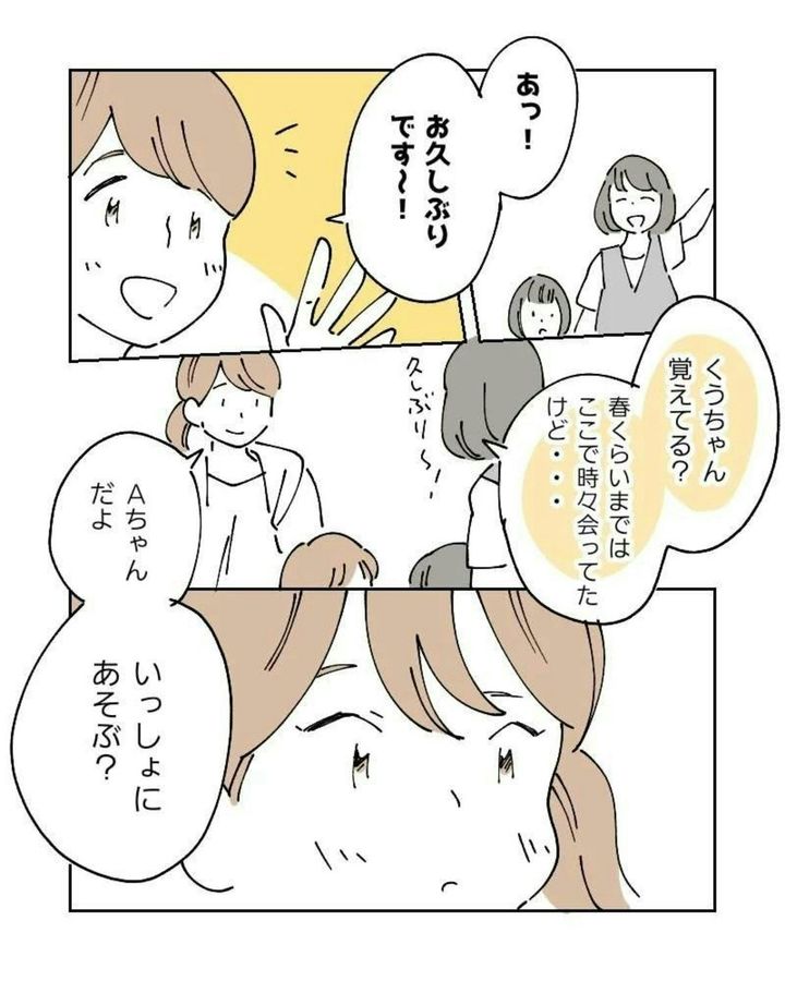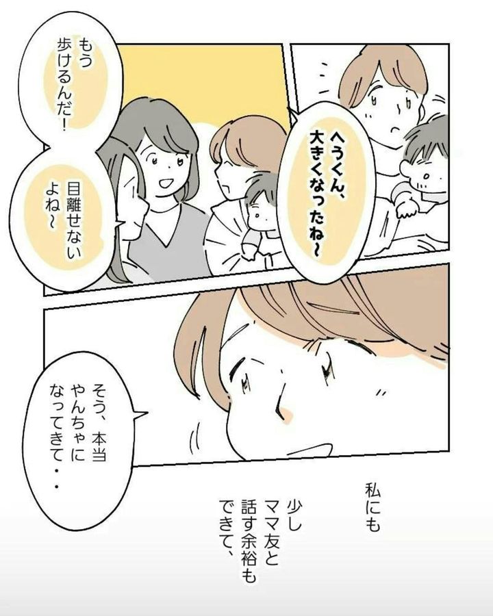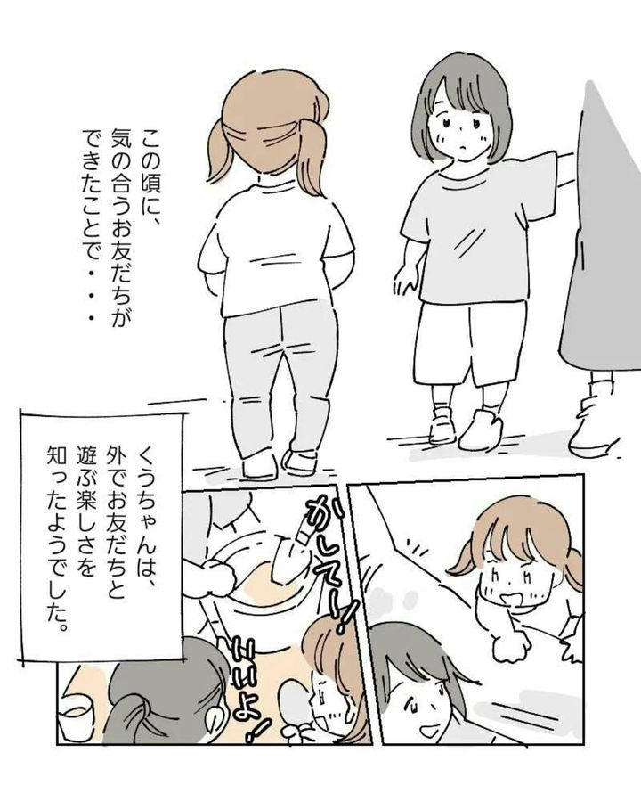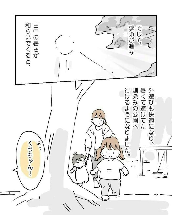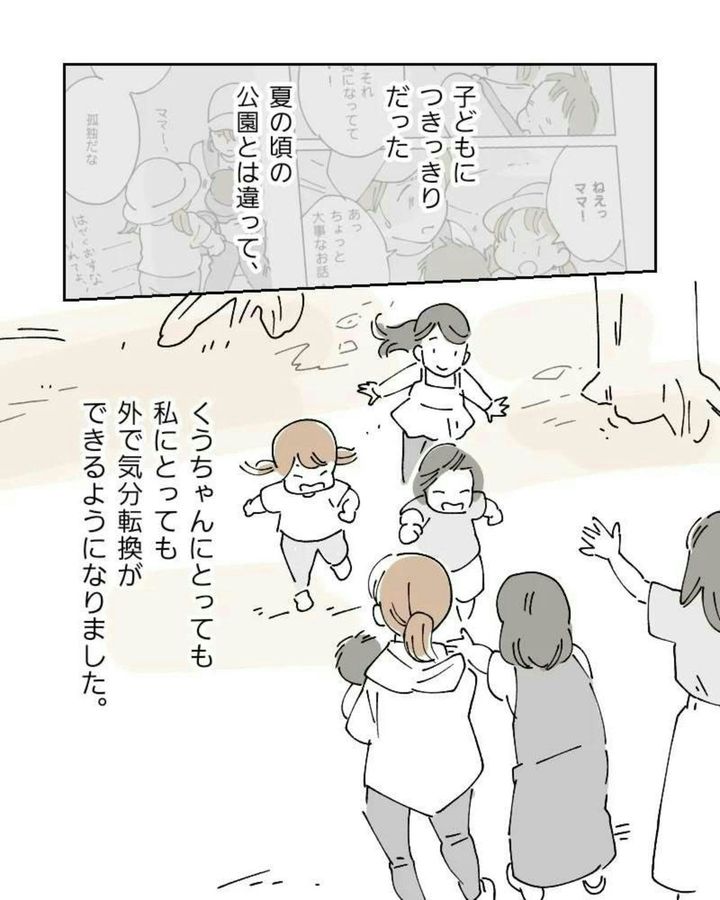 3歳のくうちゃんは、公園に行ってもお友だちと遊ぶことができず、マキノさんは付きっきりでした。そのため、せっかく公園にでかけても、ストレスが溜まるばかりでした…。