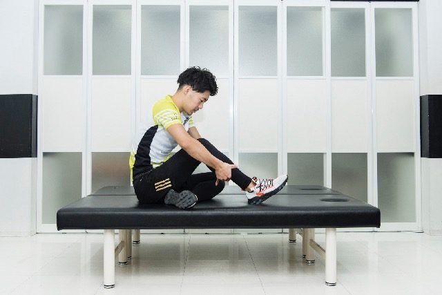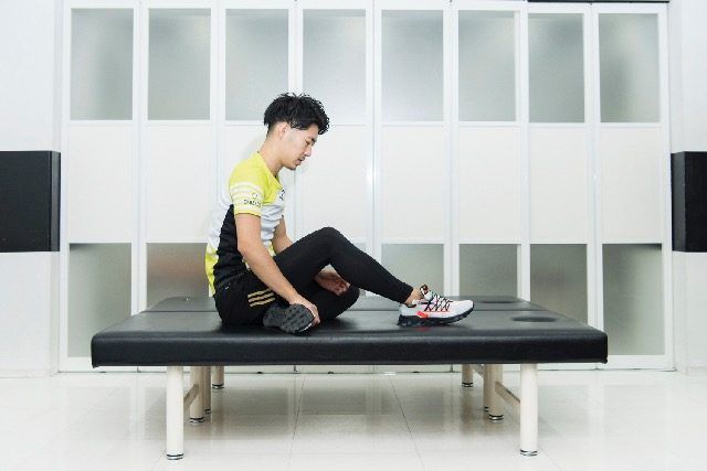 (3)両手で指圧しながら、足首を上下に10回動かす