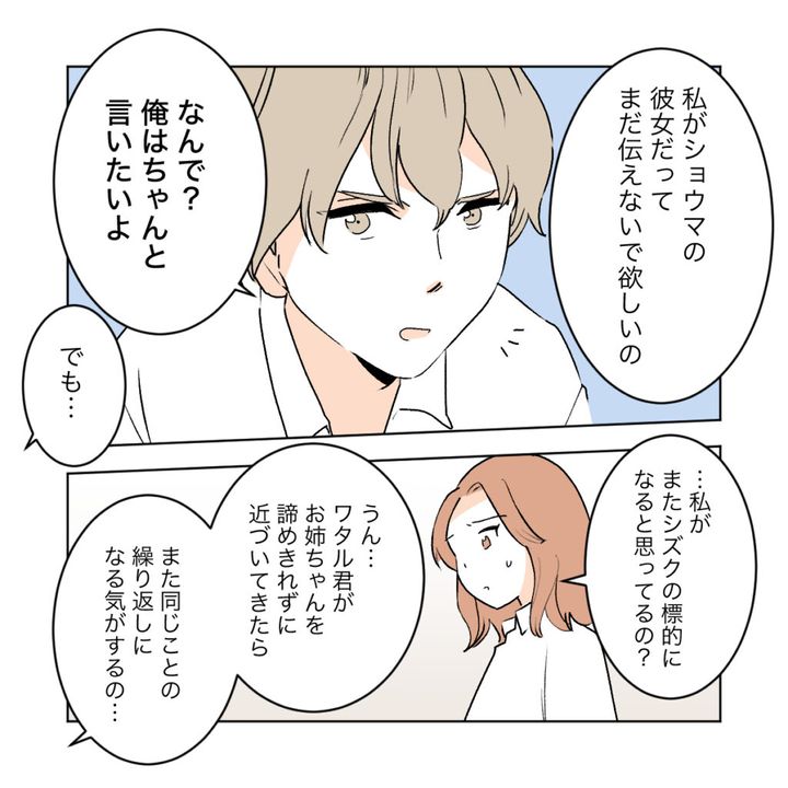 『ワタルに近づくな』と脅す手紙。もしワタルとシズクが付き合っているのなら、もうカエデには嫌がらせの手紙は届かなくなるし、これ以上サクラに危害が及ぶこともなくなるはずだと考えたサクラ、ショウマ、そしてカエデ。そこで、ショウマがワタルに単刀直入に聞いてみることになりました。サクラは「私がショウマの彼女だってまだ伝えないで欲しい」とショウマに念を押しました。ちゃんと言いたいショウマですが、サクラには何か思うところがあるようです。「私がまたシズクの標的になると思ってるの?」とカエデが聞いてみると「うん。ワタル君がお姉ちゃんを諦めきれずに近づいてきたら、また同じことの繰り返しになる気がするの・・・」とサクラは言いました。