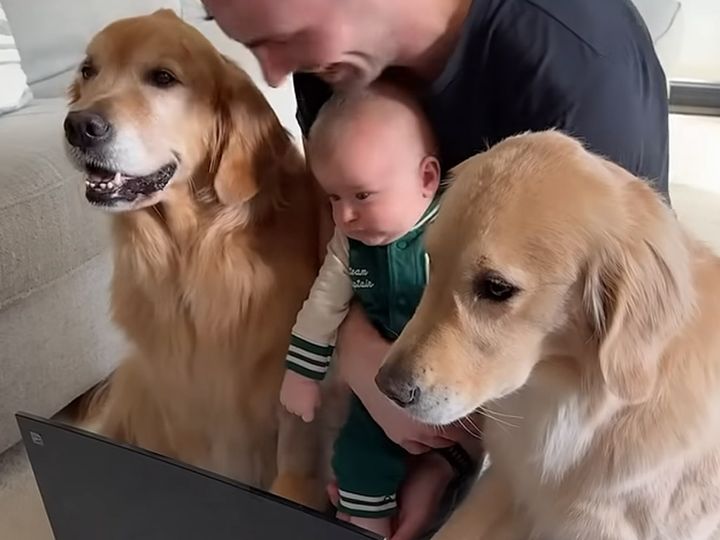 2. 赤ちゃんとゴールデンの“手形記念”♡ 仲良しさんたちの成長記録が微笑ましい
