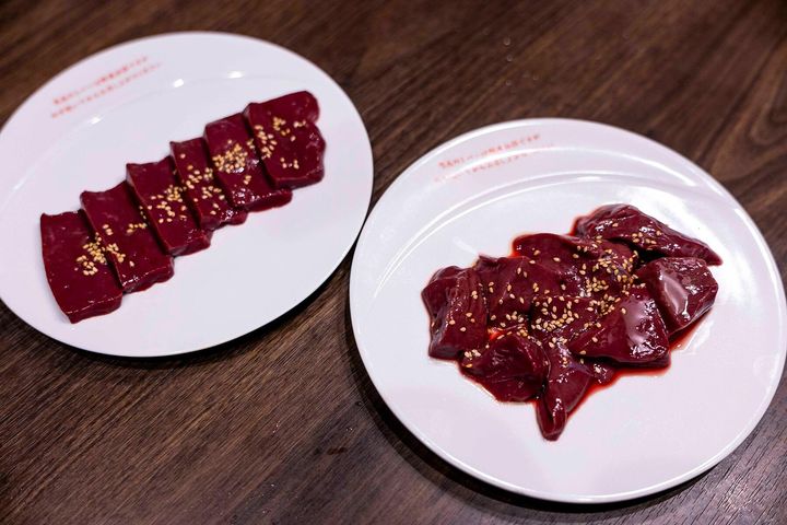 メニューに2種類あるレバーは平日限定の「新鮮レバー」1,738円と「切り落としレバー」1,188円の2種類。もっとも平日ならばどちらも個体は同じ。新鮮~の方はいい型が取れるいわゆる上レバー。澄んだ味わいだ。一方切り落とし~は細かく血管や筋が巡っている部分から切り出したもの。どうしても不揃いになるが、僕はこちらの方がレバーらしい鉄くさい味が濃くて好み。食べ比べるもよし、好みを選ぶもまたよし、だ。