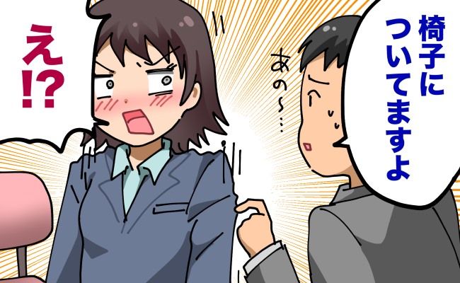 「あの…椅子に…」トイレへ行こうと席を立つと、同僚男性からまさかの指摘。彼の視線の先には