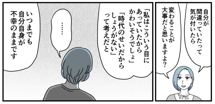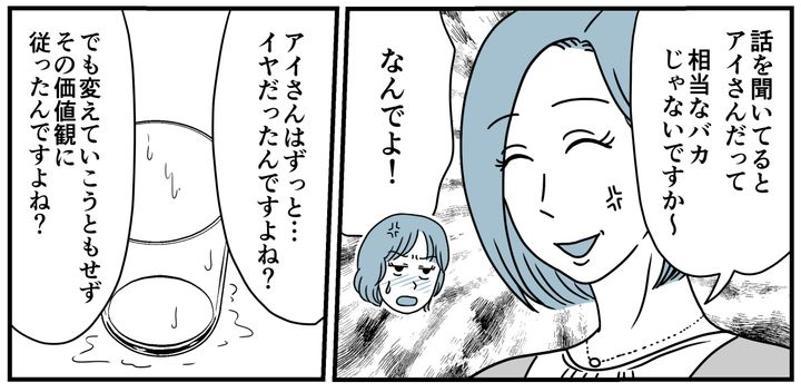 バカな父、バカな母、バカな兄2人に、バカな兄嫁たち……。私はそんなふうに見下していました。けれど価値観がおかしいと思ったのに声をあげなかった、変わろうとしなかった。そんな私のことを、マリカさんは「あなたこそバカ」だと言い放ちました。