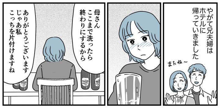 やがて兄夫婦はホテルに向かいました。今回は実家ではなくそちらに泊まるそうです。マリカさんの言葉が気になったまま、私は空になったグラスをぼんやりと見つめていました。厨房からは後片付けをしている両親の声が聞こえてきます。