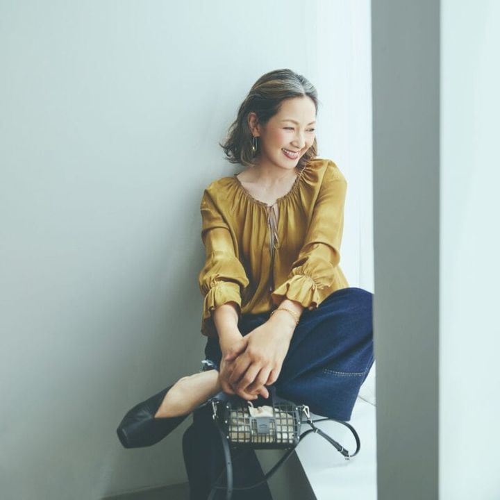 ブラウス¥60,500、デニムパンツ¥71,500/ともにスザンヌ ボマー(ウールン商会)、バッグ¥148,500/ドメスティック(アッシュ・ぺー・フランス)、バングル¥19,800/マナ ローザ ジュエル(マナ ローザ)、ピアス¥49,500/リューク、靴/スタイリスト私物