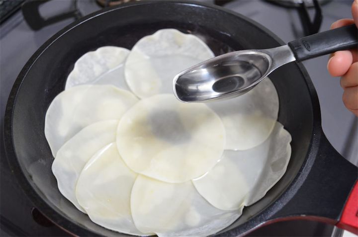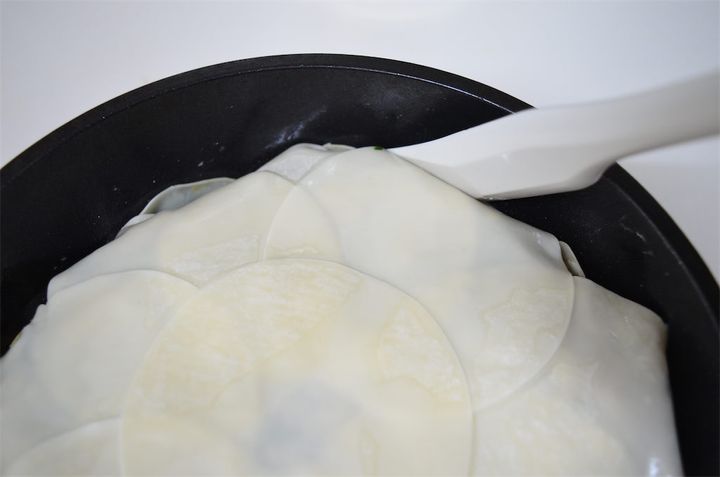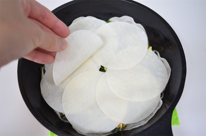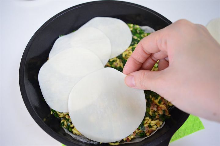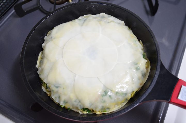 4. その上に餃子の皮(8枚)を敷き詰め、水(30ml)を回しかけ、残りの肉ダネを入れて平らに広げる。その上に餃子の皮(9枚)をフタをするように並べ、水(30ml)を回しかけ、周りを接着させるようにフライパンにそって折り込む。