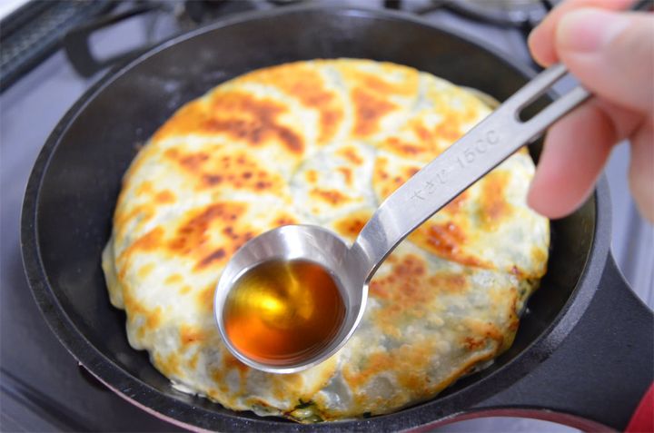5. 火にかけ、フタをして7分間蒸し焼きにする。裏返してさらに7分間、フタをして蒸し焼きにする。途中で、ゴマ油(大さじ1)を回し入れる。