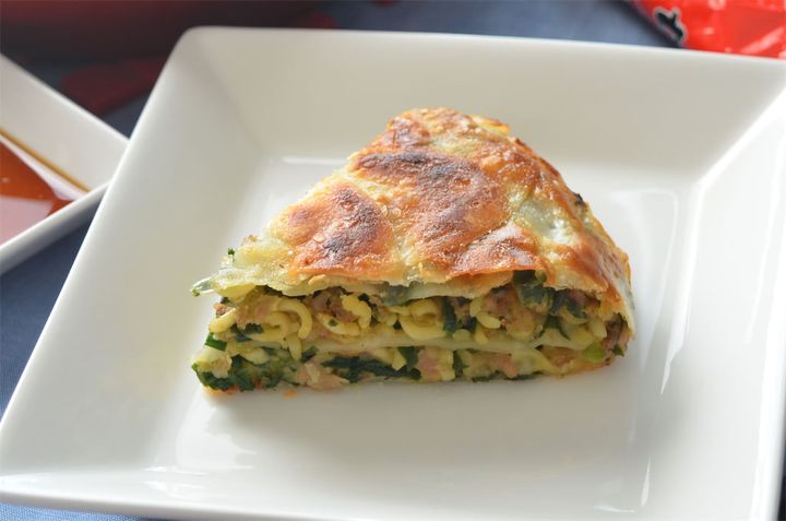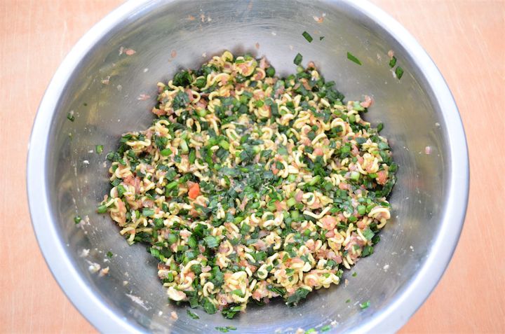 麺はバリバリ砕いて入れるので、焼く過程で蒸されてやわらかくなります。