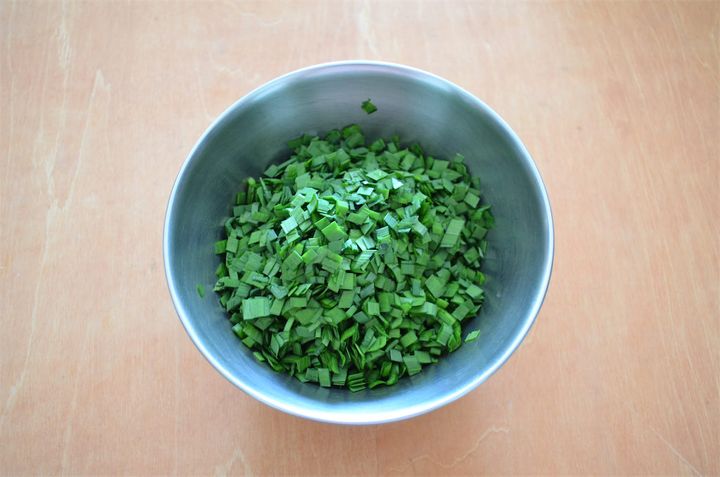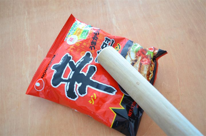 1. 辛ラーメンは袋の上から細かく砕く。ニラは粗みじん切りにする。