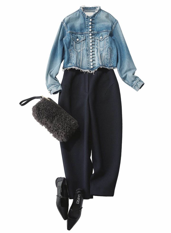 デニムジャケット¥88,000(チノ/モールド)パンツ¥66,000(ユナス/エストネーション)バッグ¥35,200(オルセット/オルサ)パンプス¥36,300(シーセイ/アイネックス)