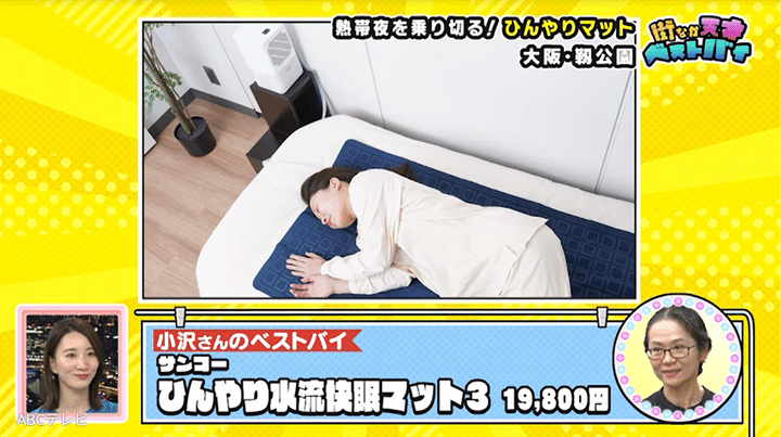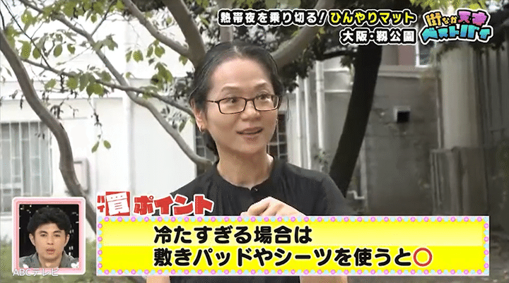 靭公園にいた女性会社員のベストバイは、サンコーのひんやり水流快眠マット。電源を入れると、マット全体に水が流れて循環し、冷感を一晩中持続させます。このマットの1時間当たりの電気代は、わずか0.2円だそう! 彼女いわく、「エアコンを使うと喉が枯れるので、これを試したらエアコンがいらなくなりました」とのことです。