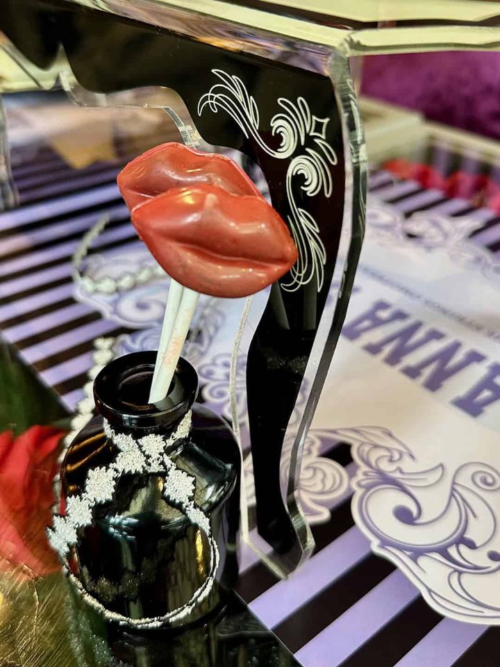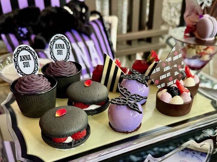 スイーツ:ANNA SUIパープルモンブランマフィン、ブラックマカロンのラズベリーサンド 、パープルバタフライムース、ラズベリーのレッドローズムース、ベリーのチョコレートタルト