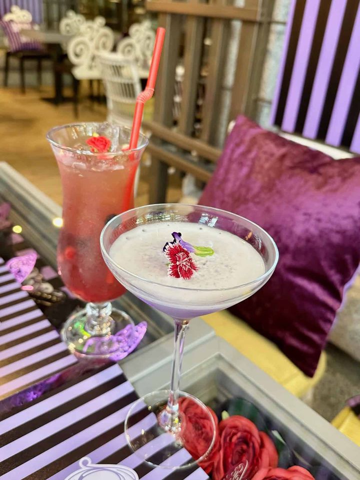 スペシャルドリンク 左:スカーレットロマンス(ノンアルコール) ¥1,610 右:ファンタジーブルーム(アルコール) ¥1,972「ファンタジーブルーム」は、シグネチャーカラーのパープルをイメージしてフローラルなテイストを加え、2種のエディブルフラワーを浮かべた甘く幻想的なカクテル。「スカーレットロマンス」は、ANNA SUIのローズをモチーフにした、ベリー×ローズフレーバーの爽やかなアイスティー。