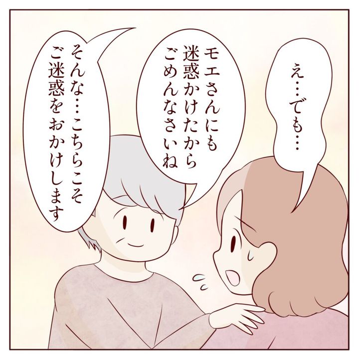 「え・・でも・・」と申し訳ない気持ちでそう言うと、「モエさんにも迷惑かけたからごめんなさいね」と謝る義母に、「そんな・・こちらこそご迷惑をおかけします」と謝りました。