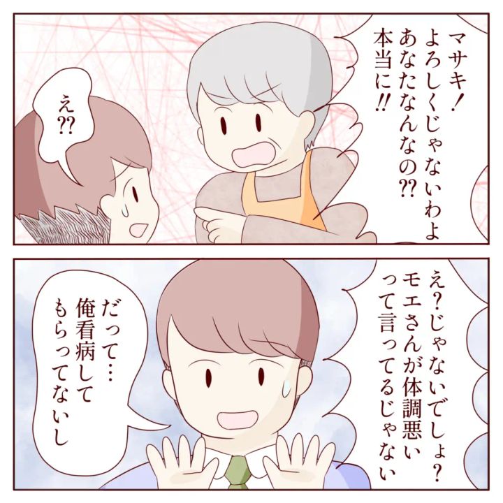 「マサキ!よろしくじゃないわよ。あなたなんなの??本当に!!」とマサキさんを叱る義母。「え??」マサキさんが驚くと、「え?じゃないでしょ?モエさんが体調悪いって言ってるじゃない」義母にそう言われて「だって・・俺看病してもらってないし」マサキがそう答えると、