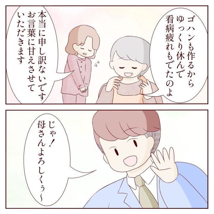 「ゴハンも作るからゆっくり休んで。看病疲れも出たのよ」とエプロンをする義母に、「本当に申し訳ないです。お言葉に甘えさせていただきます」と頭を下げていると、「じゃ!母さんよろしくぅ~」ととっとと会社に行こうとするマサキに、
