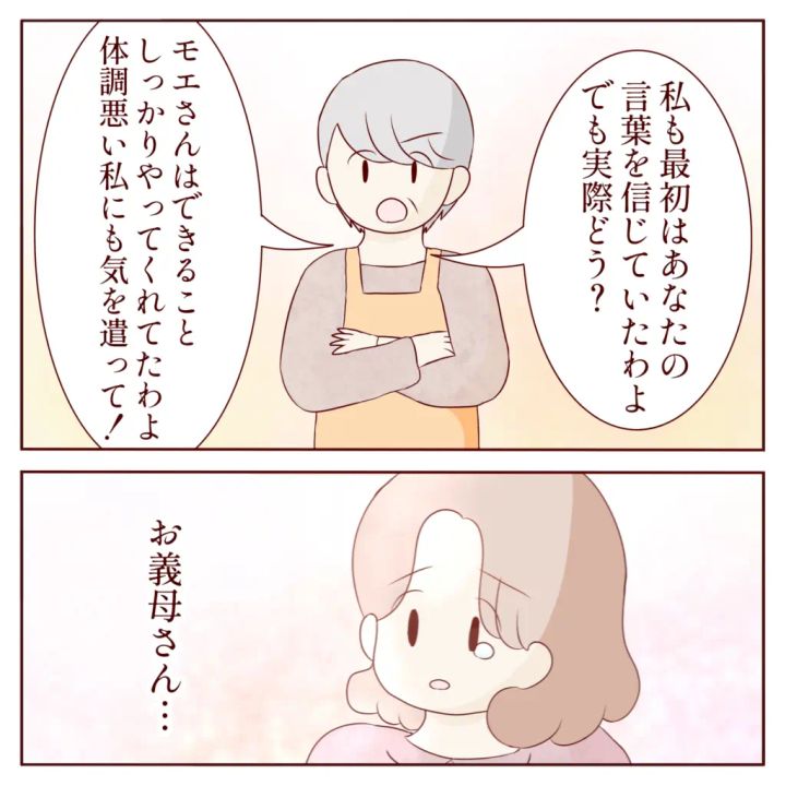 「私も最初はあなたの言葉を信じていたわよ。でも実際どう?モエさんはできることしっかりやってくれてた。体調悪い私にも気を遣って!」義母の力強い言葉に、「お義母さん・・」と涙が出てきました。