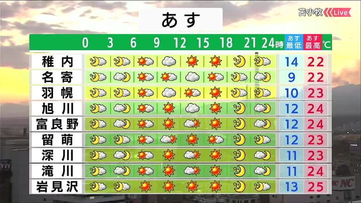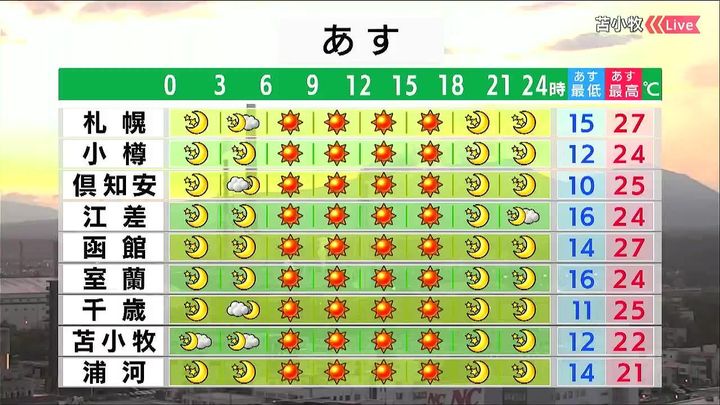 朝からカラッと晴れて、洗濯日和です。日差しが暑くて、日傘があってもいいですね。倶知安や千歳でも25度の夏日になるでしょう。