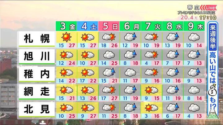 土曜も晴れて、朝晩と日中の気温差が大きくなります。日曜の午後は稚内で雨でしょう。日曜は札幌マラソンがありますが、暑さ対策が必要です。来週水曜から木曜は高い山で雪がまじりそうです。