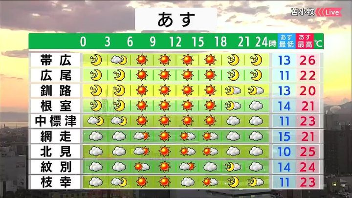 道東は晴れ、オホーツク海側は朝晩を中心に雲が広がります。気温は平年より高く、帯広の最高気温は26度と10月とは思えない暑さです。