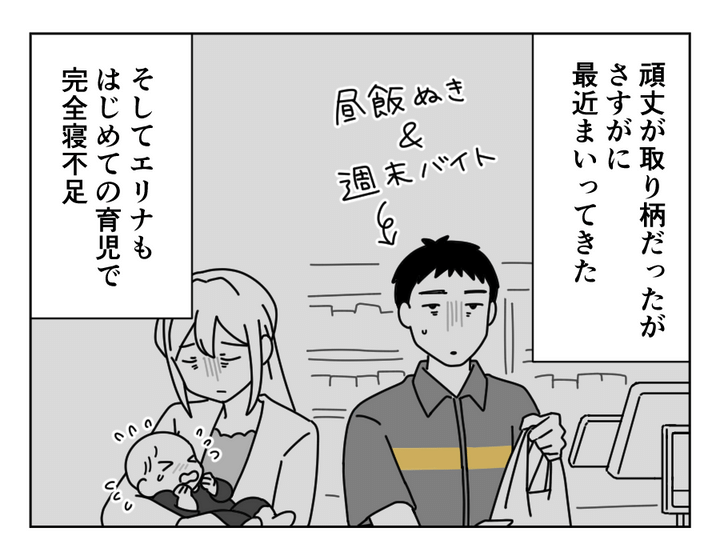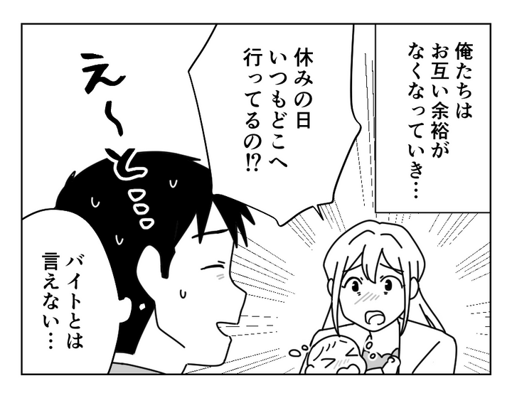 「休日はバイトを頑張っている」と言えたらどれだけいいか……。しかし借金のことは内緒にしておきたいケイシさん。エリナさんにどれだけ詰め寄られようと、笑ってごまかすしかありませんでした。そのため、残念ながらエリナさんにとって今のケイシさんは、「土日もひとりで遊びに出かけて育児にはまったく関わろうとしないパパ」。借金のことがなかったとしても、もうそれだけで愛想をつかされそうな話ですよね。