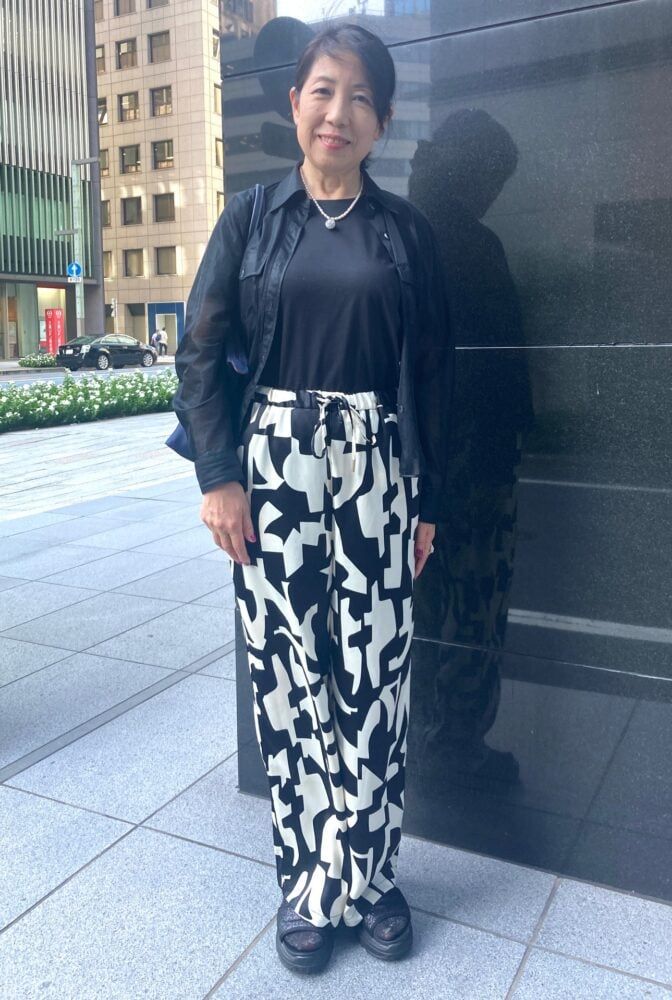 素敵なあの人の素敵カルチャースクール参加者で素敵な装いの方をキャッチ!黒でも地味になりすぎない、大胆な柄のパンツでスタイリッシュなコーディネートをしている本多さん。「シアーシャツは数年前に買ったものですが、いま流行なので合わせてみました。襟つきなので、程よくきれいめに着こなせて重宝しています。好みの色や柄を着ていると気持ちも上がるので、着たいものを着るのが私のおしゃれのこだわりです」
