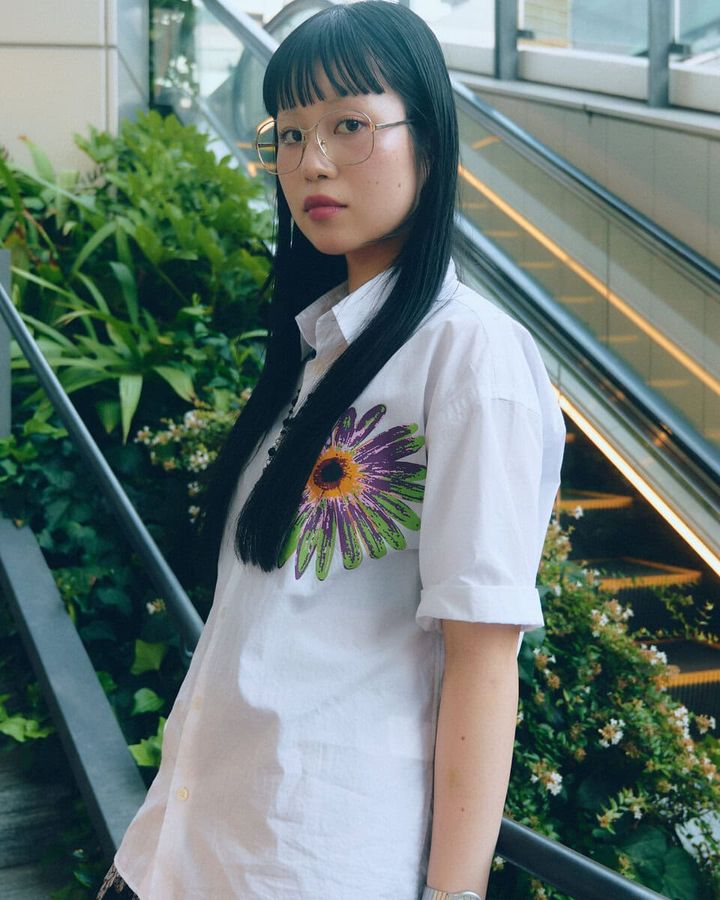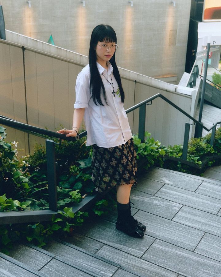 3. 【スナップ】柄スカート、ロザリオ、細身のシューズ…数々のフェミニン要素の花柄メンズシャツを合わせて
