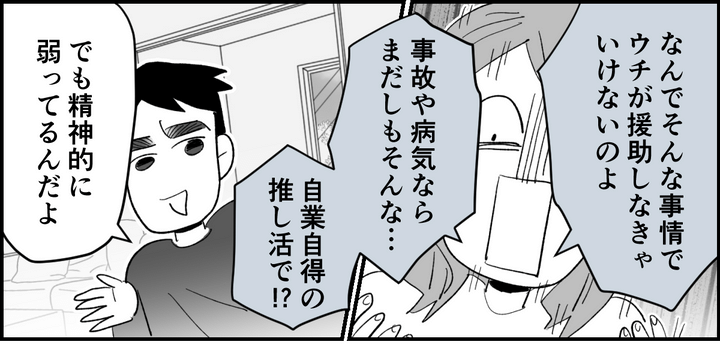 どうしてそんな事情でウチがお金を出さないといけないのでしょうか。100歩ゆずって、怪我や病気で働けないとかならまだ納得できる一面があります。……だけどリンコさんの場合、ただの「推し活」! そんな理由受け入れられません。