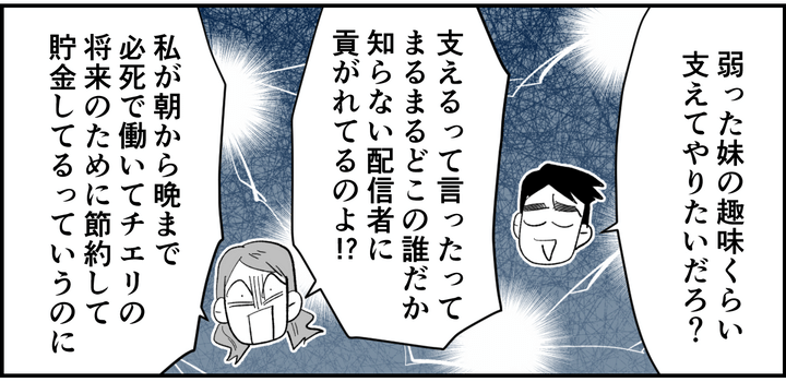 <義妹、投げ銭ビンボー>推し活、援助金ダメ「共働き」は家族のため!夫の言い訳は?【まんが】