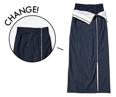 「ウエストファスナーを開けると折り返しデザイン、閉めるとオフィスでも着られるハイウエスト仕様になる優れもの」(スタイリスト・岩田さん)