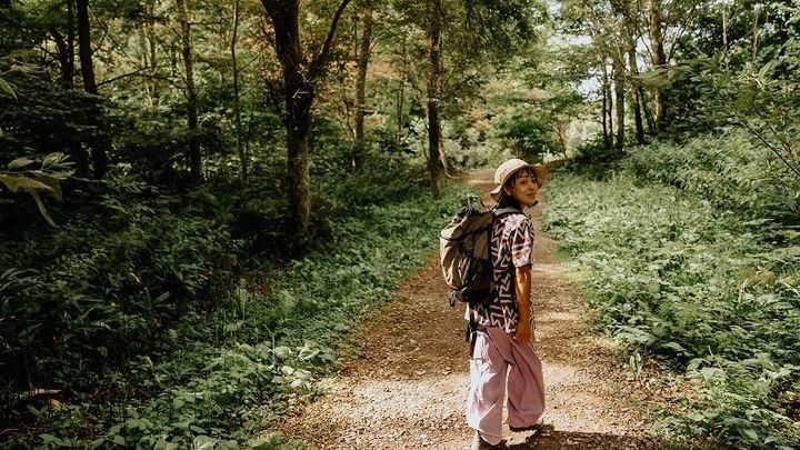 かわいらしい木箱を背負って、北海道の山を歩く一人の女性。