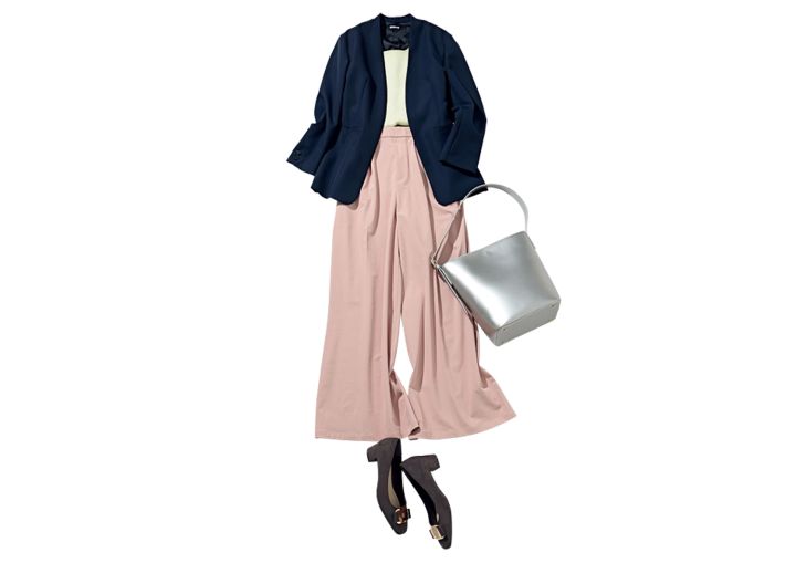 ジャケット¥34,100/ドレスレイブ(ジオン商事) 2WAYシアーシャツアンサンブル(ニット)¥19,800/アプワイザー・リッシェ ピンクワイドパンツ¥23,100/アルページュストーリー スクエアパンプス¥9,900/RANDA シルバーショルダーバッグ¥11,000/アルテミス by ダイアナ(アルテミス by ダイアナ アーバンドック ららぽーと豊洲店)