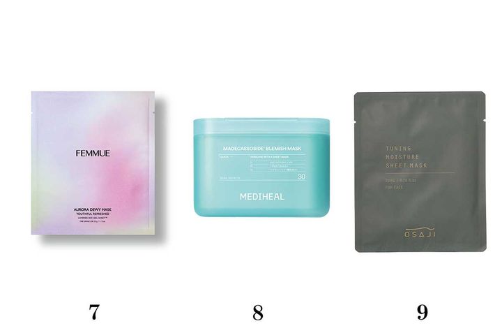 7.ファミュ オーロラデューイーマスク(SR) 5枚入り ¥3,960(数量限定/アリエルトレーディング 8.メディヒール マデカッソシド ブレミッシュマスク[30枚マスク] ¥2,640/韓国高麗人蔘社 9.オサジ チューニング モイスチャー シートマスク 1枚 ¥770