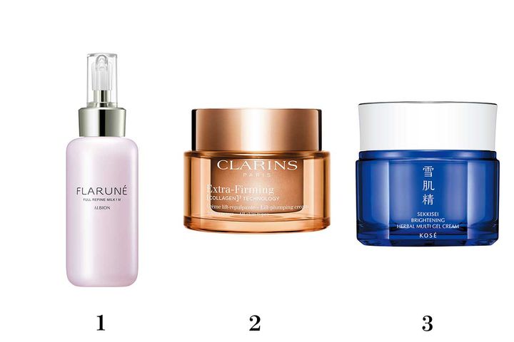 1.フラルネ フルリファイン ミルク f M 200g ¥5,500/アルビオン 2.クラランス ファーミング EX クリーム オールスキン 50㎖ ¥14,850 3.薬用雪肌精 ブライトニング マルチ ジェル(医薬部外品) 80g ¥4,620(編集部調べ)/コーセー