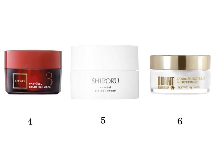 4.レカルカ ブライトリッチクリーム 30g ¥16,500 5.SHIRORU クリスタル プロテクトクリーム(医薬部外品) 30g ¥4,950(11/1発売) 6.クワント バイ マリークワント ナリッシング トリート ナイト クリーム<25> 30g ¥19,800(医薬部外品)/マリークワント コスメチックス