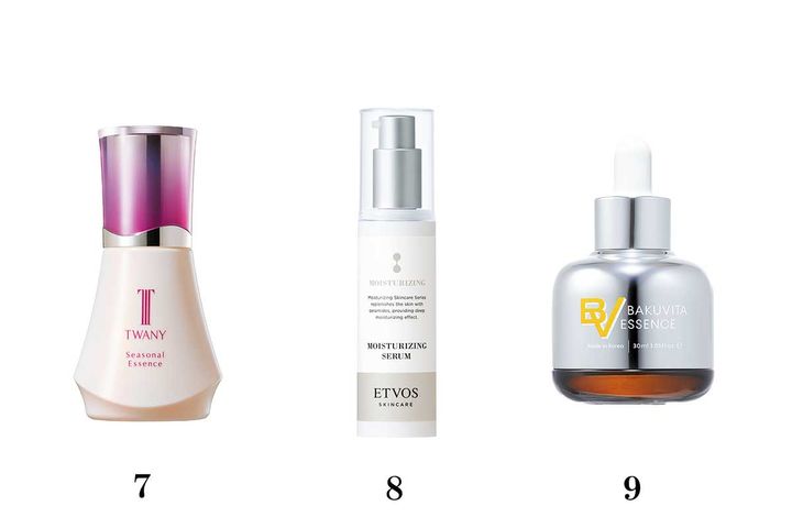7.トワニー シーズナルエッ センスa AW 25㎖ ¥6,600(限定)/カネボウ化粧品 8.エトヴォス モイスチャライジングセラム 50㎖ ¥4,620 9.mgb skin バクビタエッセンス 30 ㎖ ¥5,940