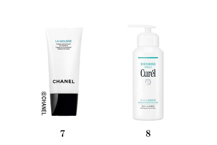 7.シャネル ラ ムース 150㎖ ¥8,470 8.キュレル 潤浸保湿 泡ジェル洗顔料(医薬部外品) 200g ¥2,090(編集部調べ)/花王 *炭酸ガス(噴射剤)