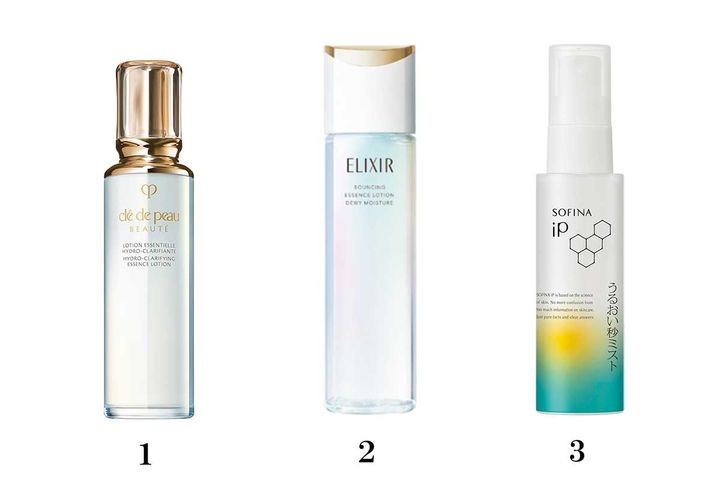 1.クレ・ド・ポーボーテ ローションエサンシエル C 170㎖ ¥14,300 2.エリクシール リフトモイスト ローション ba(みずみずしい)(医薬部外品) 170㎖ ¥3,410/資生堂 3.ソフィーナ iP うるおい秒ミス ト 50㎖ ¥1,980(編集部調べ)/花王