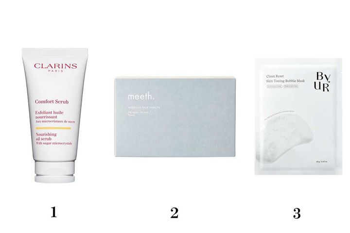 1.クラランス コンフォート オイル スクラブ 50㎖ ¥4,950 2.ミース モアリッチパック スムース ¥12,980 3.バイユア クリーンリセット スキントーニング バブルマスク ¥396/Hamee