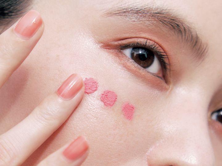濃淡をつけてぼかすのが厚化粧に見えない&膨張しないコツ。チークを顔の中心(黒目の下あたり)に置いてそこを一番濃くし、そこから外側に向かって薄くぼかしていくことで、自然な血色と立体感が出ます。