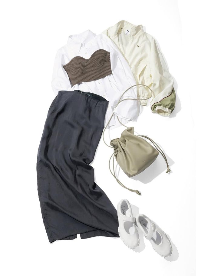 ナイロンジャケット¥9,900スニーカー¥15,400(ともにプーマ/プーマ お客様サービス)シャツ¥49,500(エステータ/オンワード樫山 お客様相談室)ビスチェ¥27,500(フィーニー)スカート¥33,000(イレーヴ)バッグ¥45,100(ヴァジック/ヴァジックジャパン)
