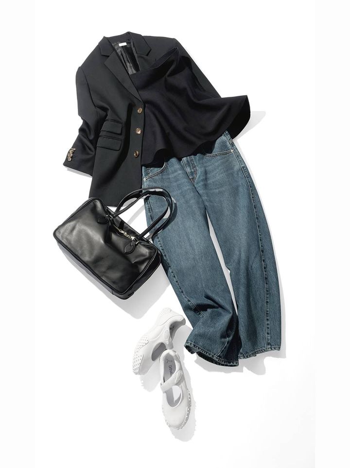 ジャケット¥61,600(シー/エスストア)ニットビスチェ¥27,500(サードマガジン)デニム¥15,400(リーバイス フォー ジャーナル スタンダード/ジャーナル スタンダード 自由が丘店)バッグ¥49,500(ラシット/ラシット 大丸梅田店)スニーカー¥15,400(プーマ/プーマ お客様サービス)
