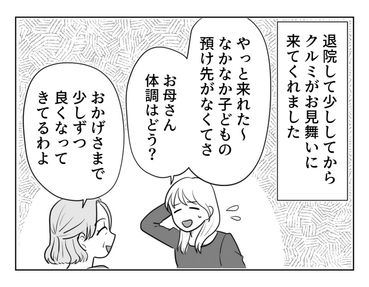 私(実母)は夫と2人暮らし。正社員で働く長女のアンナは、しっかり者の甘え下手。専業主婦の次女のクルミは甘え上手の無頓着。2人とも子育て真っ最中です。私自身が早くに母を亡くしたため、自分は元気に長生きをして、娘たちが困ったときがあれば力になってあげたいと思っていました。しかし少し頑張りすぎた私は、体調を崩して入院。今まで私に頼りっきりだったクルミを責めるアンナ。そんな姿を見て、私は大切なことに気がつきました。