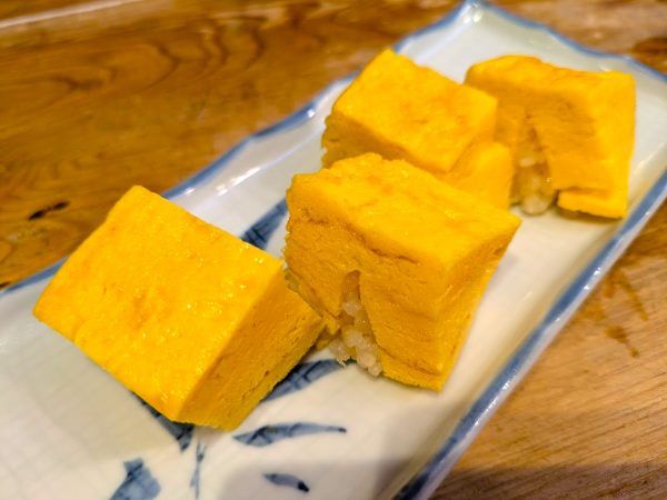 厚焼き玉子(4貫) 308円 分厚い厚焼き玉子の握り寿司が4貫。めっちゃ分厚い厚焼き玉子の中に赤酢のシャリが!ヘルシーです。