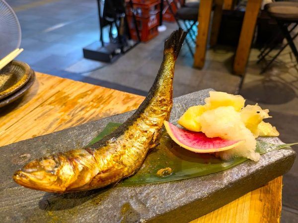 大とろ鰯塩焼き 748円 まるで、料亭の天ぷらのようなカタチで出てきました。大トロいわし!北海道道東海域にごく僅かな期間現れるという、脂ノリ抜群のマイワシです。