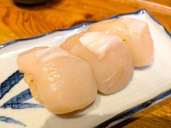 ホタテの握り(3貫) 550円 ぽってりとした帆立の身に、甘く上品な味わいに、しっとりとした食感。おいしいです。赤酢のシャリもおいしいです。魚、お寿司がおいしいおっきゃがり、魚介を中心としたヘルシーな料理、アラカルト料理などが楽しめ、これからの季節は海鮮から肉や鍋まで楽しめるおっきゃがりでした。